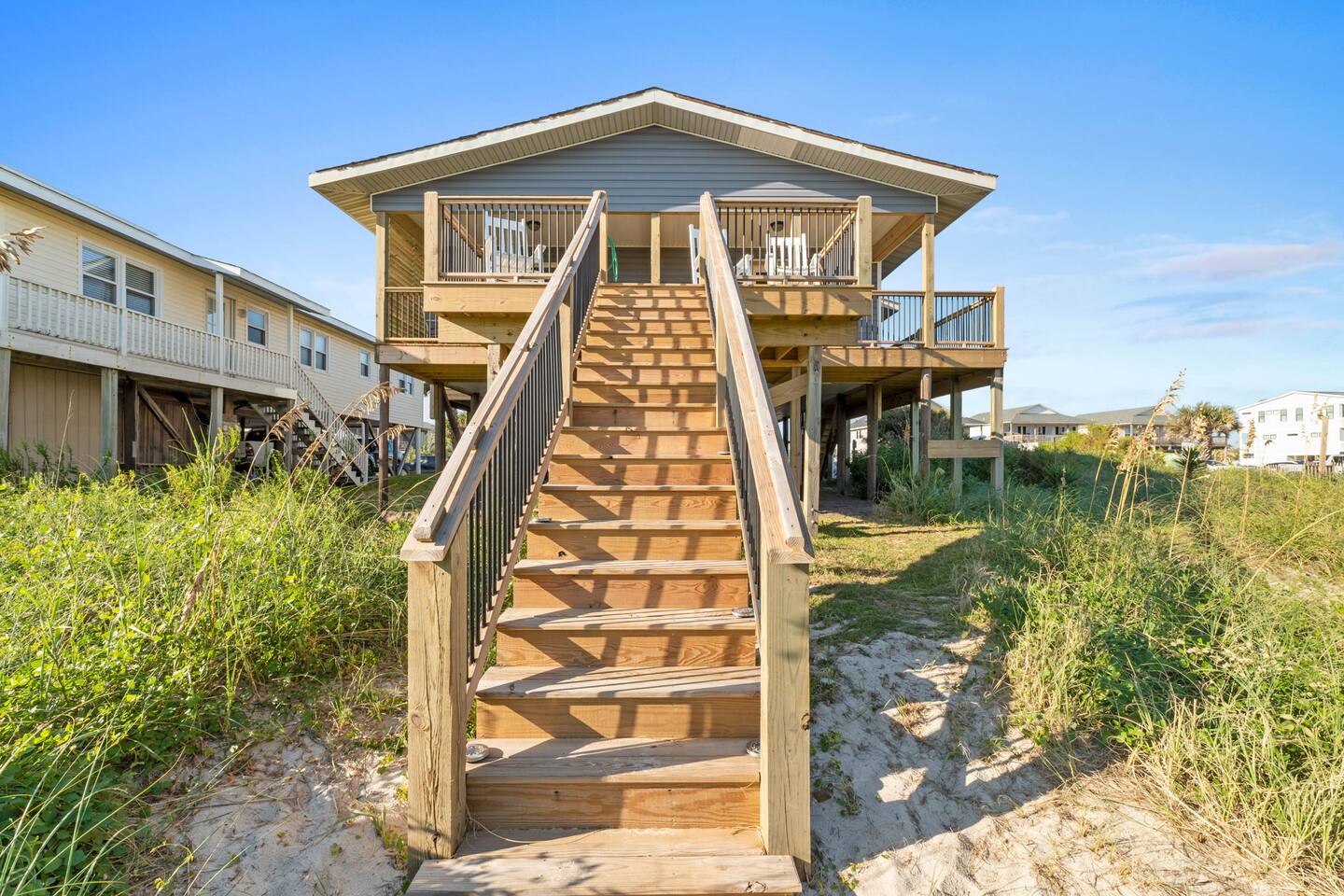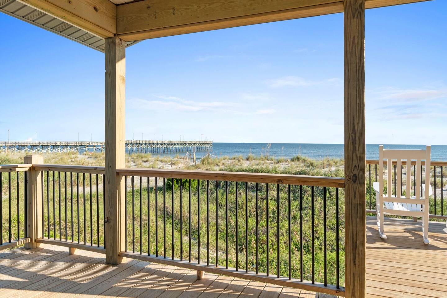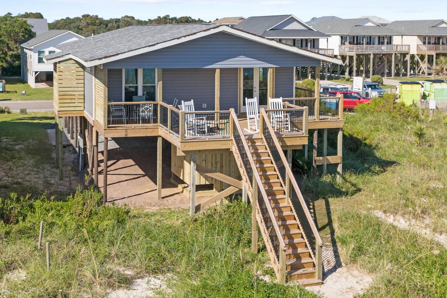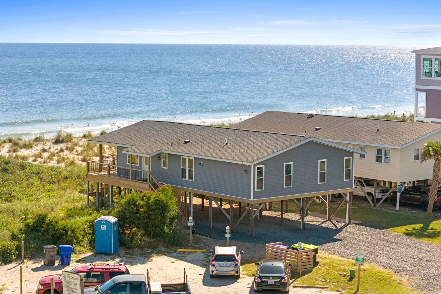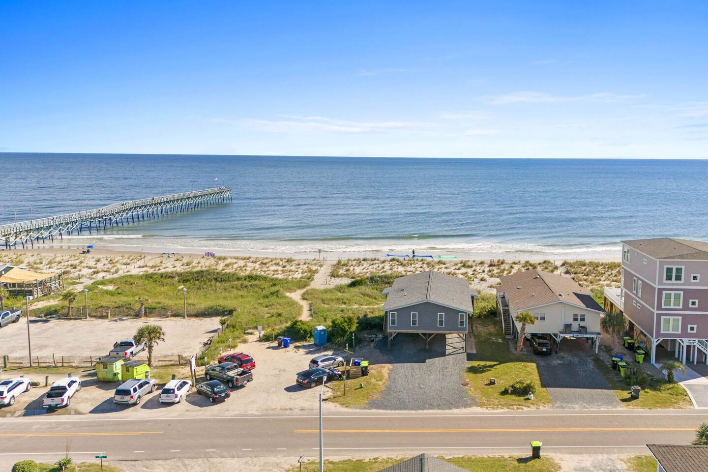 Welcome to Memorable Moments OKI. Completely renovated in 2024. Everything is brand new. 5-bedroom, 5-bath beachfront house (5 master suites). 6 total beds, sleeps 11. Clean & spacious. 1 deck w/ panoramic views. Outdoor shower. Free parking for 4 vehicles (2 covered and 2 uncovered). Direct beach access, soft Oak Island sand just down the front steps. High speed internet, Spectrum cable, smart TVs in all bedrooms. Bring your passwords. Perfect retreat for families or a group of friends. One of North Carolina’s premier beaches. You’ll love the views that Memorable Moments OKI has to offer! **BEDROOMS: Bedroom 1: Master bedroom suite with closet. Large window with oceanfront view. King bed. Walk-in tile shower. Bedroom 2: Queen bed. Shower/tub combo. Bedrooms 3 - 4: Queen bed. Walk-in tile shower. Bedroom 5: Twin XL over queen bunk bed. Walk-in tile shower. All bedrooms are well appointed with flat screen TV's, high speed internet, cable and Roku/ smart tvs. **LIVING ROOM: Living area includes: couch, 3 chairs, dining table for 8, family games and books, 65” flat screen TV, ocean views. **FRONT DECK: The ocean-facing deck offers beautiful ocean and pier views with additional seating. You'll find a convenient dining table, great for outdoor meals or playing board games. **KITCHEN INFO: Modern kitchen with luxury stainless steel appliances including refrigerator, smooth top range, oven, microwave, dishwasher, and kitchen sink. Additional: 4-slot toaster, Kuerig with single serve and drip coffee, additional 12-cup drip coffee maker, French press, coffee grinder, 10-qt crock pot, waffle maker, Oster blender. Kids’ plates, cups and utensils. Generously supplied with all items needed to serve and cook for a large crowd. Bar seating for 3, dining table seating for 8, with additional table seating on the ocean-facing deck. **ADDITIONAL AMENITIES: - Linens provided and beds made, including bath towels - Park style charcoal grill (bring your own charcoal) - Pack-and-Play (please bring your preferred linens for your little one!) - High chair booster seat (collapsible) - Washer and dryer with sample-sized laundry detergent, fabric softener, dryer sheets - Beach amenities – 6 beach chairs, 2 beach umbrellas, 1 beach wagon, beach toys - Foot wash station - Bathroom toiletries – hand soap, soap, shampoo, conditioner, 2 rolls of toilet paper - Welcome/starter kit includes: dish soap, sponge, kitchen towel, roll of paper towels, 2 trash bags, 2 dishwasher pods, sample coffee, tea, creamer, seasonal gift