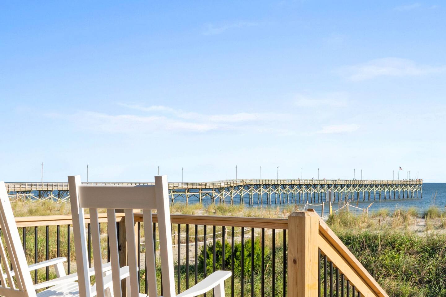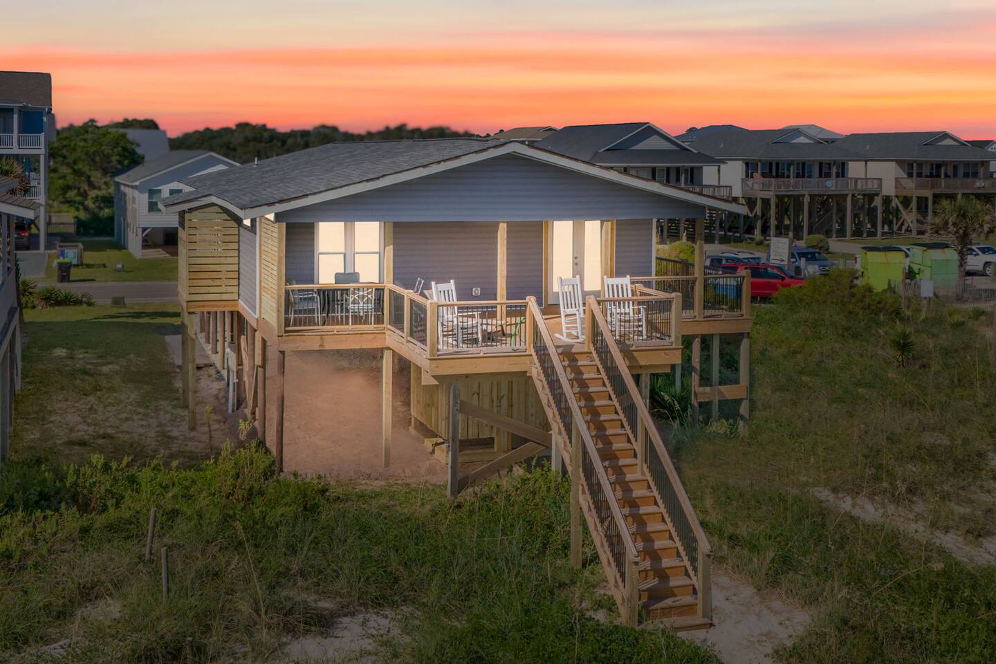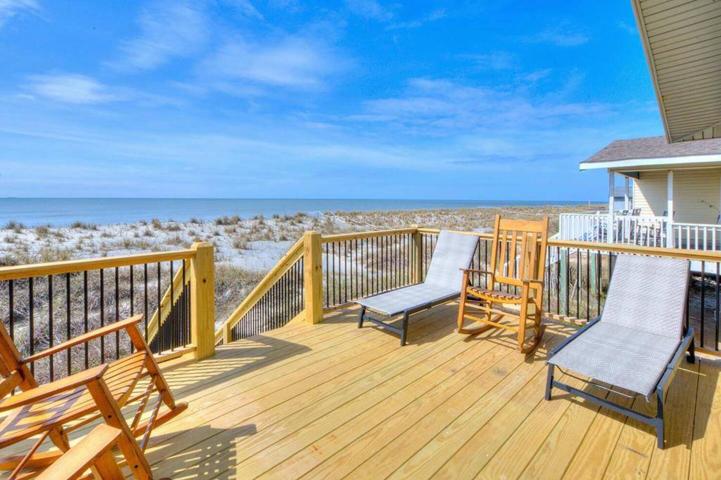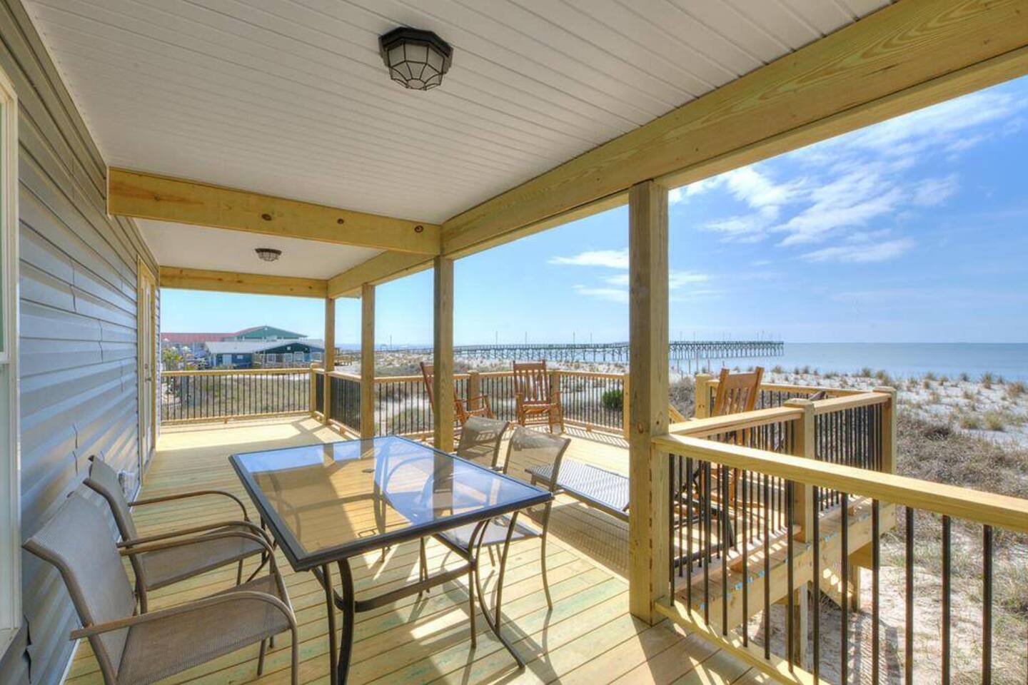Welcome to Memorable Moments OKI. Completely renovated in 2024. Everything is brand new. 5-bedroom, 5-bath beachfront house (5 master suites). 6 total beds, sleeps 11. Clean & spacious. 1 deck w/ panoramic views. Outdoor shower. Free parking for 4 vehicles (2 covered and 2 uncovered). Direct beach access, soft Oak Island sand just down the front steps. High speed internet, Spectrum cable, smart TVs in all bedrooms. Bring your passwords. Perfect retreat for families or a group of friends. One of North Carolina’s premier beaches. You’ll love the views that Memorable Moments OKI has to offer! **BEDROOMS: Bedroom 1: Master bedroom suite with closet. Large window with oceanfront view. King bed. Walk-in tile shower. Bedroom 2: Queen bed. Shower/tub combo. Bedrooms 3 - 4: Queen bed. Walk-in tile shower. Bedroom 5: Twin XL over queen bunk bed. Walk-in tile shower. All bedrooms are well appointed with flat screen TV's, high speed internet, cable and Roku/ smart tvs. **LIVING ROOM: Living area includes: couch, 3 chairs, dining table for 8, family games and books, 65” flat screen TV, ocean views. **FRONT DECK: The ocean-facing deck offers beautiful ocean and pier views with additional seating. You'll find a convenient dining table, great for outdoor meals or playing board games. **KITCHEN INFO: Modern kitchen with luxury stainless steel appliances including refrigerator, smooth top range, oven, microwave, dishwasher, and kitchen sink. Additional: 4-slot toaster, Kuerig with single serve and drip coffee, additional 12-cup drip coffee maker, French press, coffee grinder, 10-qt crock pot, waffle maker, Oster blender. Kids’ plates, cups and utensils. Generously supplied with all items needed to serve and cook for a large crowd. Bar seating for 3, dining table seating for 8, with additional table seating on the ocean-facing deck. **ADDITIONAL AMENITIES: - Linens provided and beds made, including bath towels - Park style charcoal grill (bring your own charcoal) - Pack-and-Play (please bring your preferred linens for your little one!) - High chair booster seat (collapsible) - Washer and dryer with sample-sized laundry detergent, fabric softener, dryer sheets - Beach amenities – 6 beach chairs, 2 beach umbrellas, 1 beach wagon, beach toys - Foot wash station - Bathroom toiletries – hand soap, soap, shampoo, conditioner, 2 rolls of toilet paper - Welcome/starter kit includes: dish soap, sponge, kitchen towel, roll of paper towels, 2 trash bags, 2 dishwasher pods, sample coffee, tea, creamer, seasonal gift